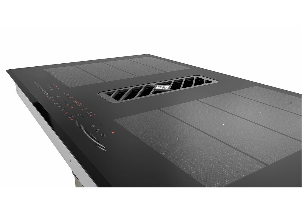 The Belling BVH83BK is an 83 cm width vented induction hob combining a full-flex induction cooking surface with an integrated downdraft extractor, designed for modern kitchen layouts and island installations. It features four flex-zones (including bridging capability), a built-in extraction system up to 650 m³/h airflow, filter-change indicator, touch-slider controls with nine power levels, and a sleek black glass finish.