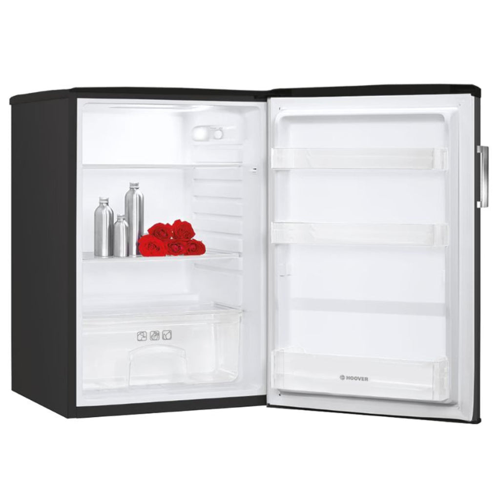 The Hoover HOL HS58EBHK is a freestanding under-counter fridge with a 127-litre net capacity, finished in sleek black. It’s designed to fit below standard kitchen worktops (850 mm height) and features a static cooling system, easy-use internal dial thermostat, and a compact footprint that makes it perfect for smaller kitchens or secondary chillers.