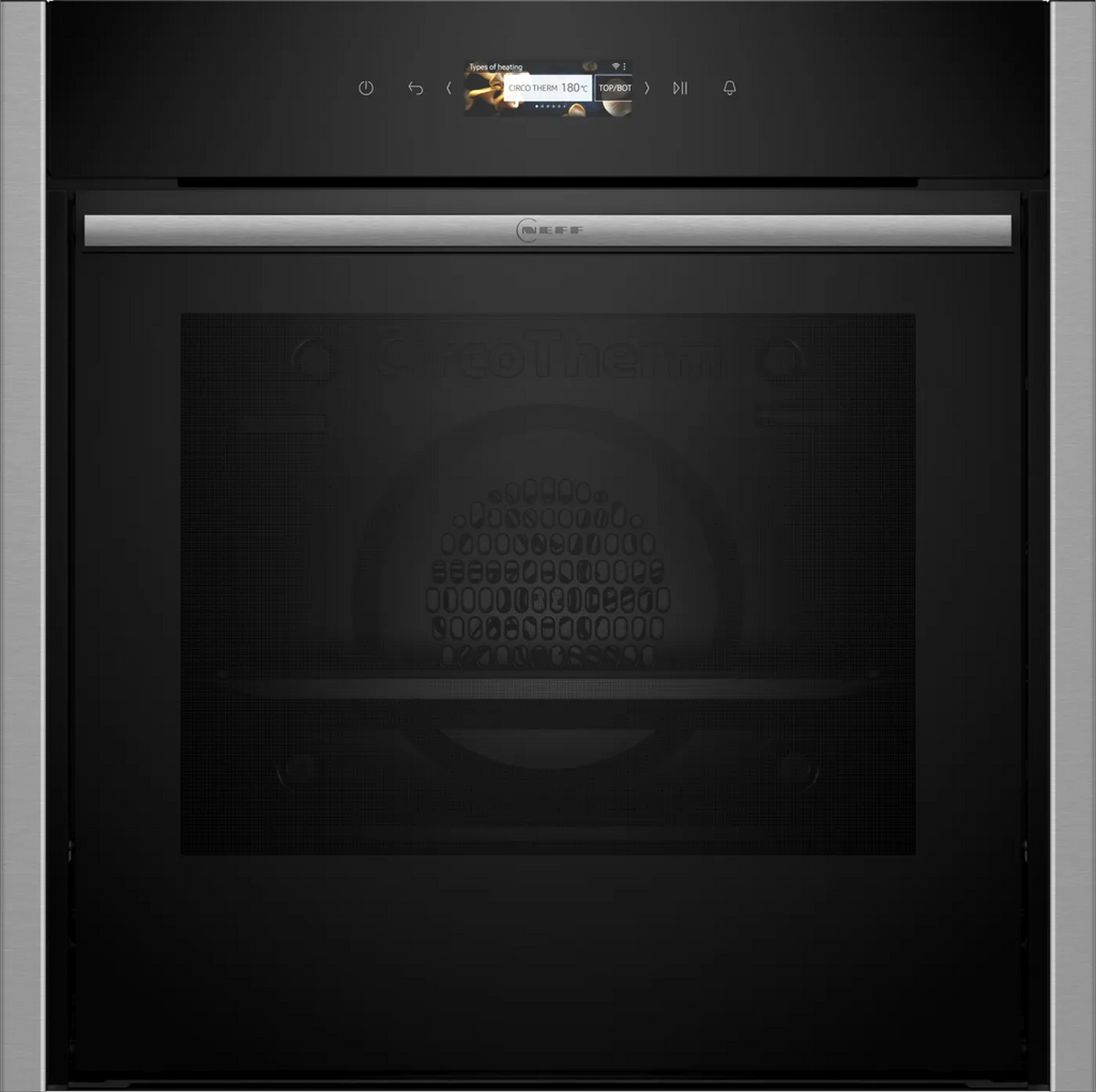 The NEFF B54CR71N0B from the N70 series is a premium built-in single oven offering a 71 litre capacity, a 3.7″ Full Touch TFT display for intuitive control, and the innovative Slide & Hide® door which retracts under the unit for full access. With CircoTherm® hot-air technology allowing simultaneous cooking on three levels, pyrolytic self-cleaning with EasyClean, and Home Connect smart connectivity, it’s designed for serious kitchen performance.
