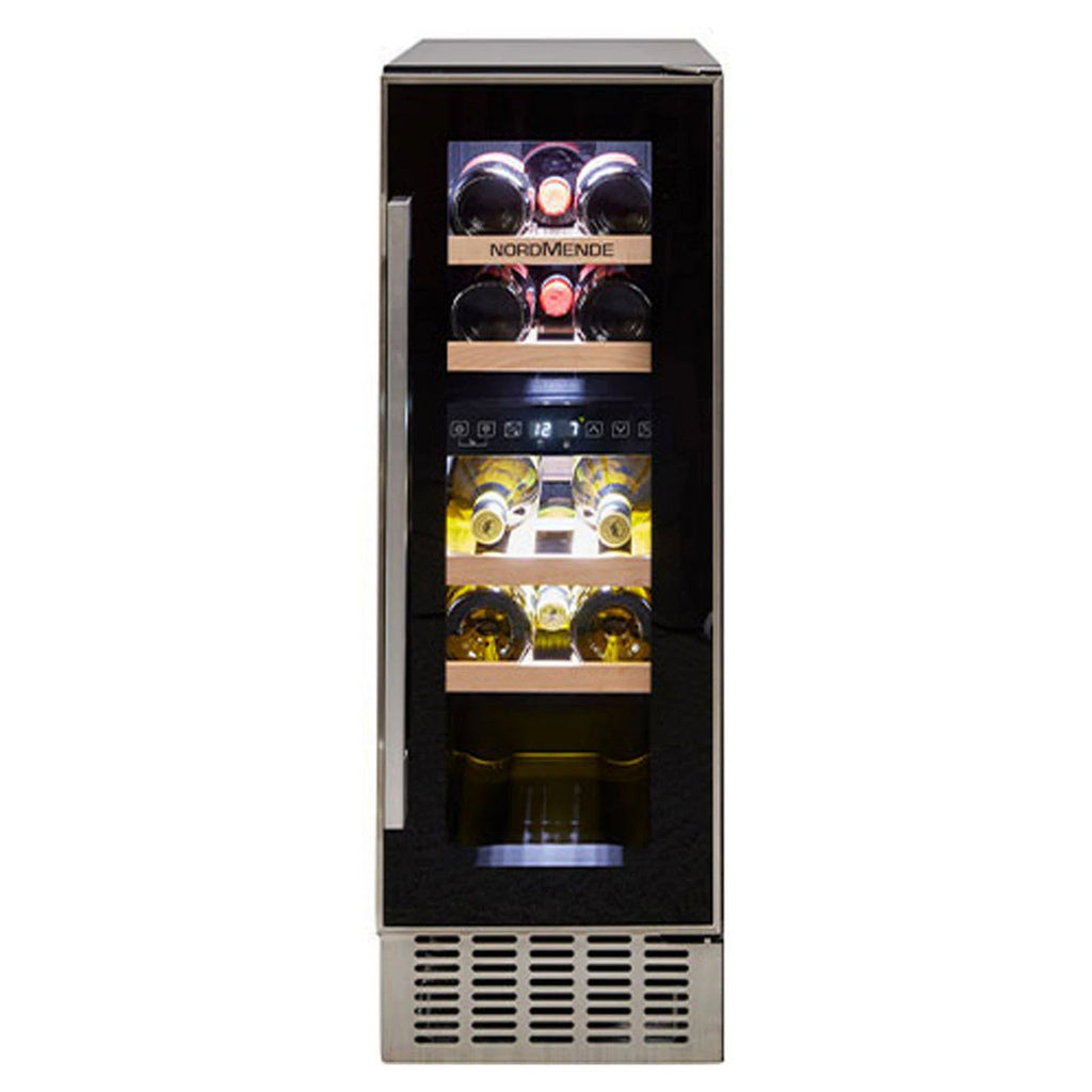 The NordMende WC17IX is a compact 30 cm-wide dual-zone wine cooler designed for freestanding or built-in installation. With a net capacity of 55 litres and space for up to 17 standard 750 ml bottles, it features adjustable temperature ranges (5-22 °C) in both zones, LED interior lighting, a reversible door and quiet operation. A stylish inox-edged finish gives a premium look for modern kitchens or wine-centres.