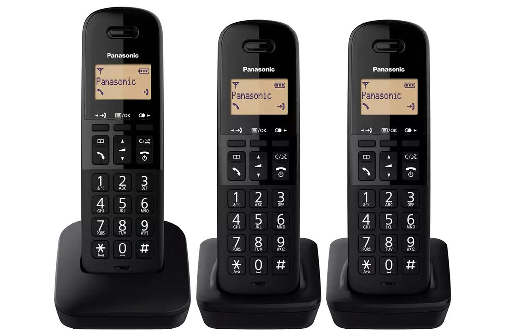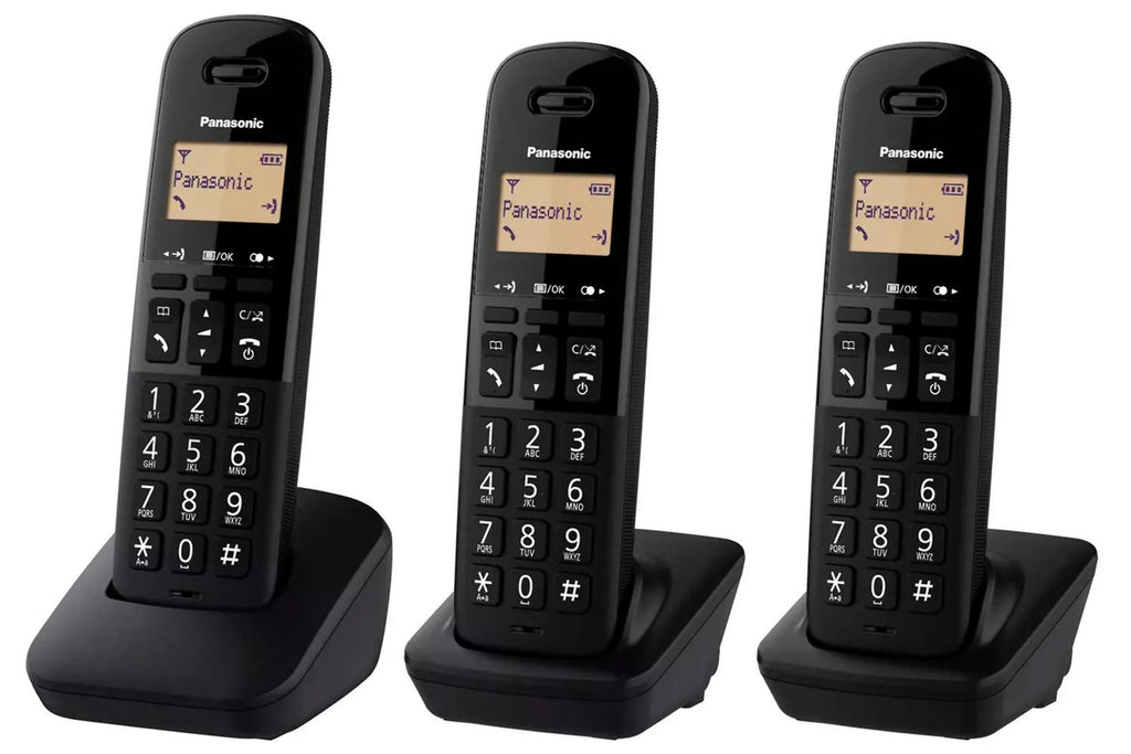 Stay connected across your home with the Panasonic KX-TGB613EB cordless phone system, which comes with three handsets for all rooms. It features nuisance call block (up to 50 numbers), enhanced receiver volume for clearer sound, and up to 18 hours of talk time with 200 hours standby. The intuitive menu, large buttons, and intercom capability between handsets make it practical and easy to use.