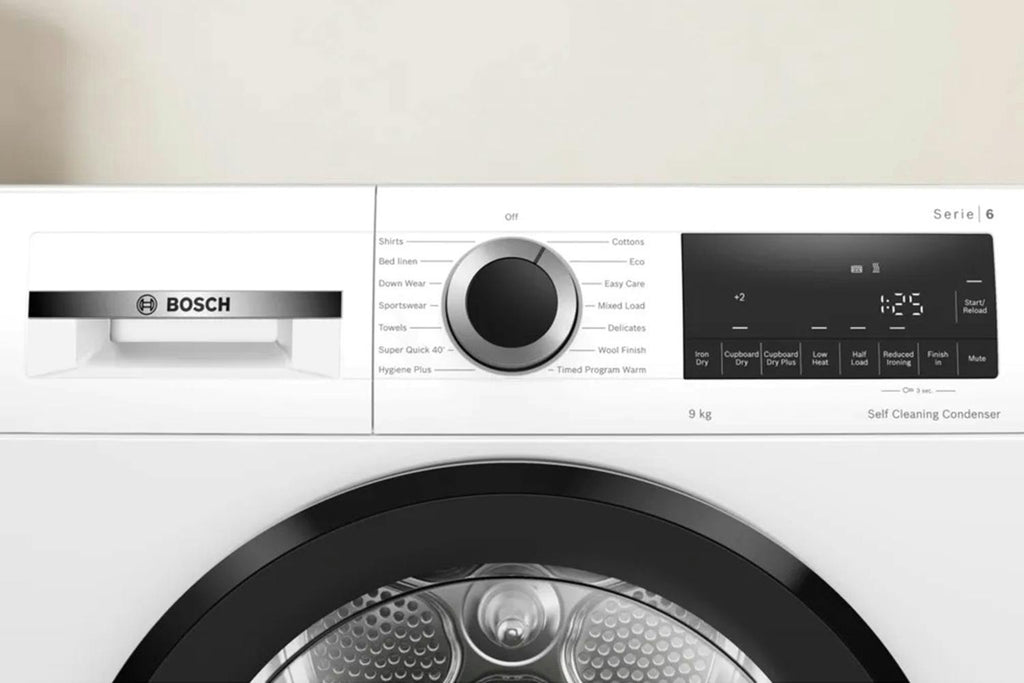 Dry smarter with the Bosch WQG24500GB — a high-efficiency 9 kg heat pump tumble dryer designed for modern laundry needs. Featuring a Self-Cleaning Condenser, this dryer automates maintenance by clearing fluff during each cycle, preserving energy efficiency over time. The AutoDry sensor system stops when the load is perfectly dry, preventing over-drying. Other highlights include a Super Quick 40 mode for small loads, a bed linen programme with reversing drum to reduce tangling, and a quiet AntiVibration design. Bosch backs it with a 5-year parts warranty (when registered) and Quiet Mark certification for low-noise operation.