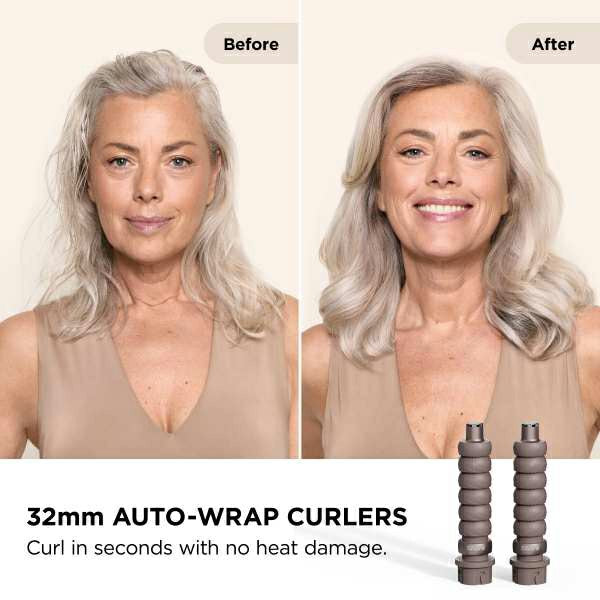Includes multiple attachments: straightening tool, styling brush, 32 mm auto-wrap curlers, concentrator, diffuser plus storage case.