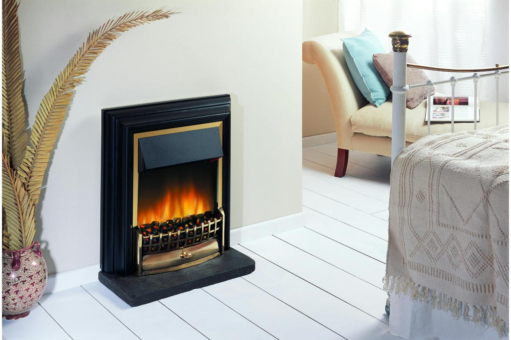 The Dimplex Cheriton CHT20XBR freestanding electric fire blends traditional styling with contemporary electric heating convenience. With a black and brass-effect finish, this unit features realistic coal fuel bed, LED Optiflame flame effect usable with or without heat, a built-in thermostat, remote control and two heat settings (1.0 kW / 2.0 kW). Easy to install—no inset depth required—and designed to sit flat against the wall.