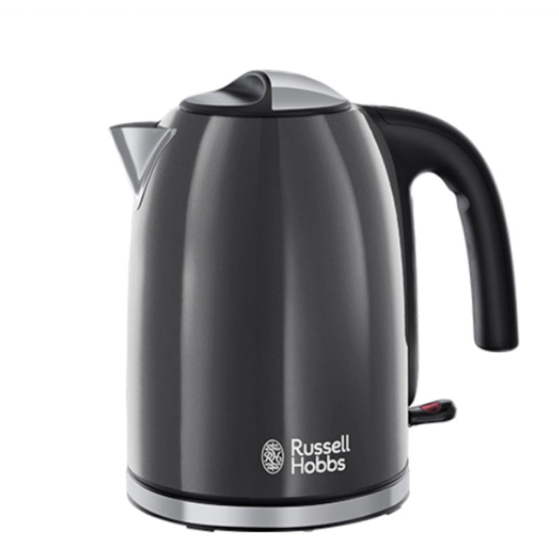 Add style and speed to your kitchen with the Russell Hobbs 20414 Colours Plus Grey Kettle. This 1.7 L kettle reaches boiling in record time—just 45 seconds per cup—thanks to its 3,000 W rapid-boil system. The kettle features a rear water gauge, 360° swivel base with cord storage, perfect pour spout to reduce spill, and a removable washable filter to keep water fresh. A sleek grey exterior with stainless steel accents ensures it fits modern and classic kitchens alike.