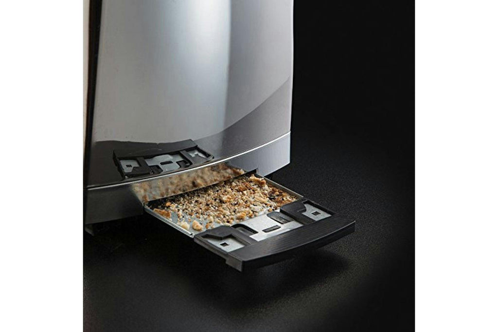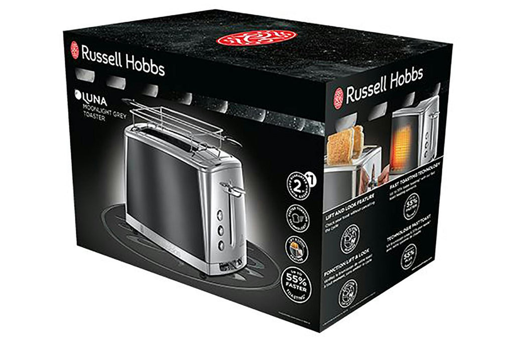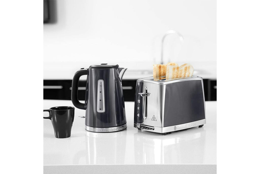 Add modern style to your kitchen with the Russell Hobbs Luna 23221 2-Slice Toaster, finished in sleek Moonlight Grey. It features extra-wide slots to accommodate thick slices, crumpets, or artisan bread. Use the browning control dial to customise your toast, and make use of its defrost, reheat, and cancel functions to get perfect results every time. The removable crumb tray makes cleaning easy, and the compact design fits neatly into smaller kitchens.
