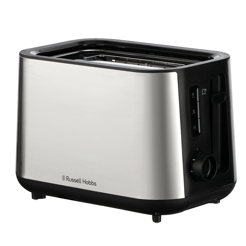 Enjoy perfectly browned toast every time with the Russell Hobbs Heaton 27390 2-slice toaster. It features wide slots (135 mm × 33 mm) to handle thick slices, bagels, and crumpets. Adjust the browning to your liking with 6 settings, and use the lift & look function to check progress mid-cycle without canceling. Additional functions include defrost, reheat, cancel, and high lift for easy removal of smaller items. The brushed stainless steel finish with black accents complements modern kitchens.